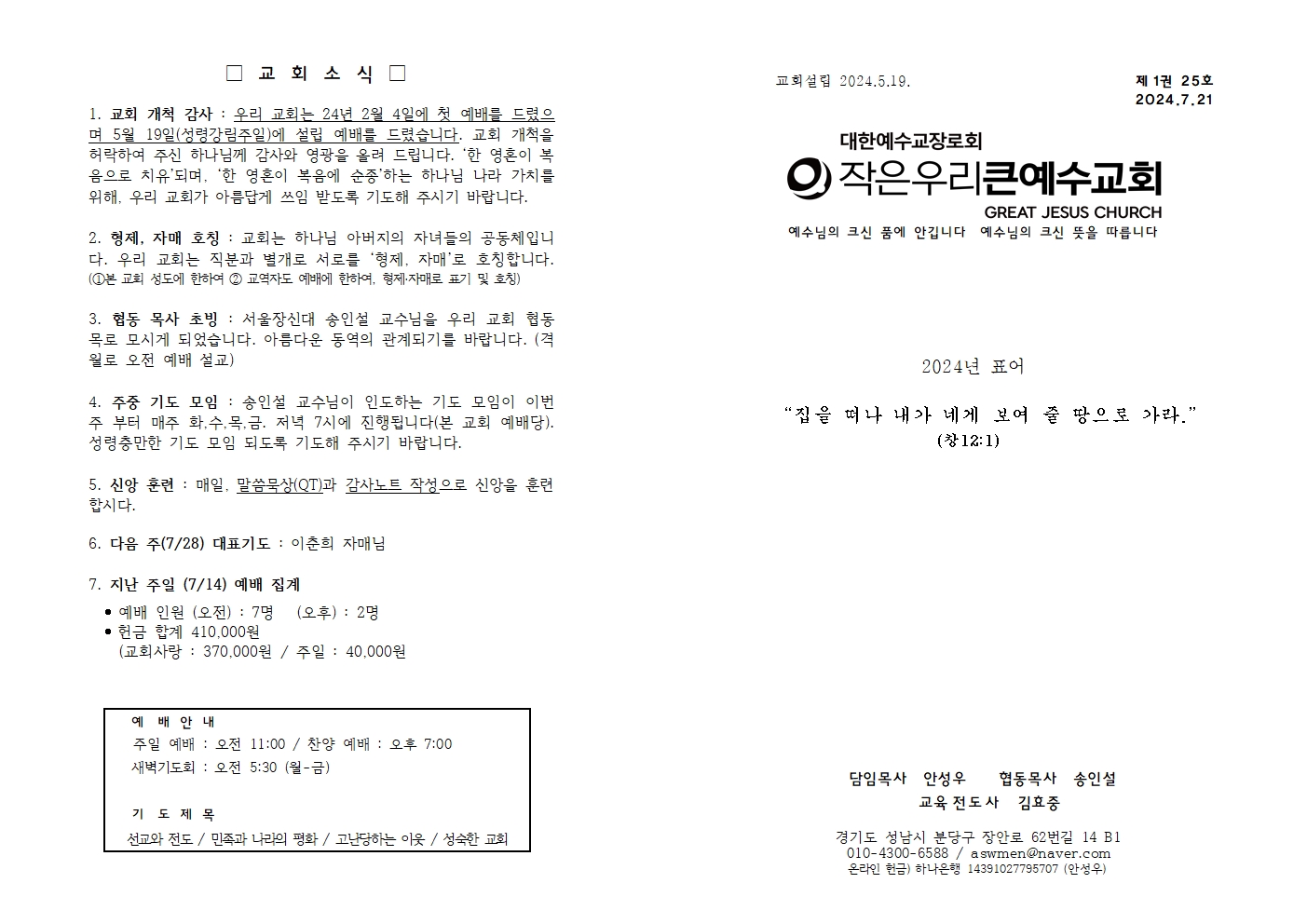 | 7월 14일 (성령강림절 후 여덟 째 주일) 주보 (0) | 2024.07.15 |