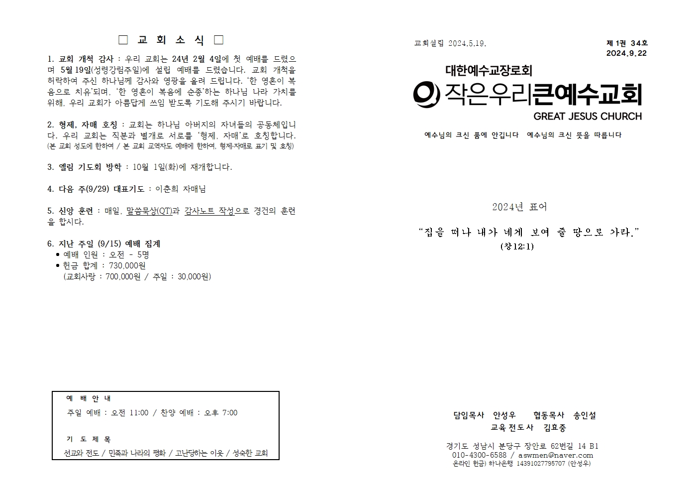 9월 15일 (성령강림절 후 열일곱 째 주일) 주보 (0) | 2024.09.15 |