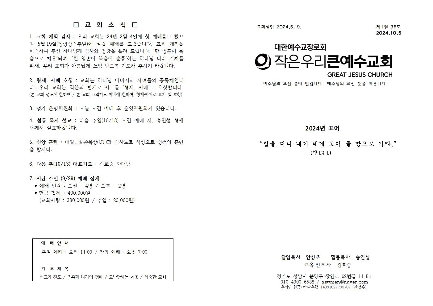| 10월 20일 (성령강림절 후 스물 둘 째 주일) 주보 (1) | 2024.10.21 |