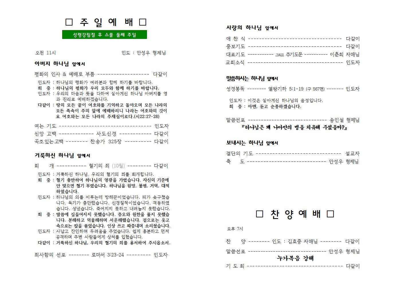 | 10월 13일 (성령강림절 후 스물 한 째 주일) 주보 (0) | 2024.10.13 |