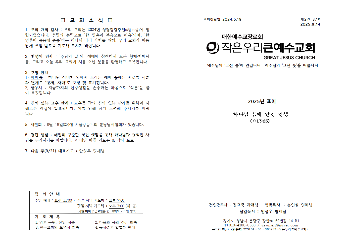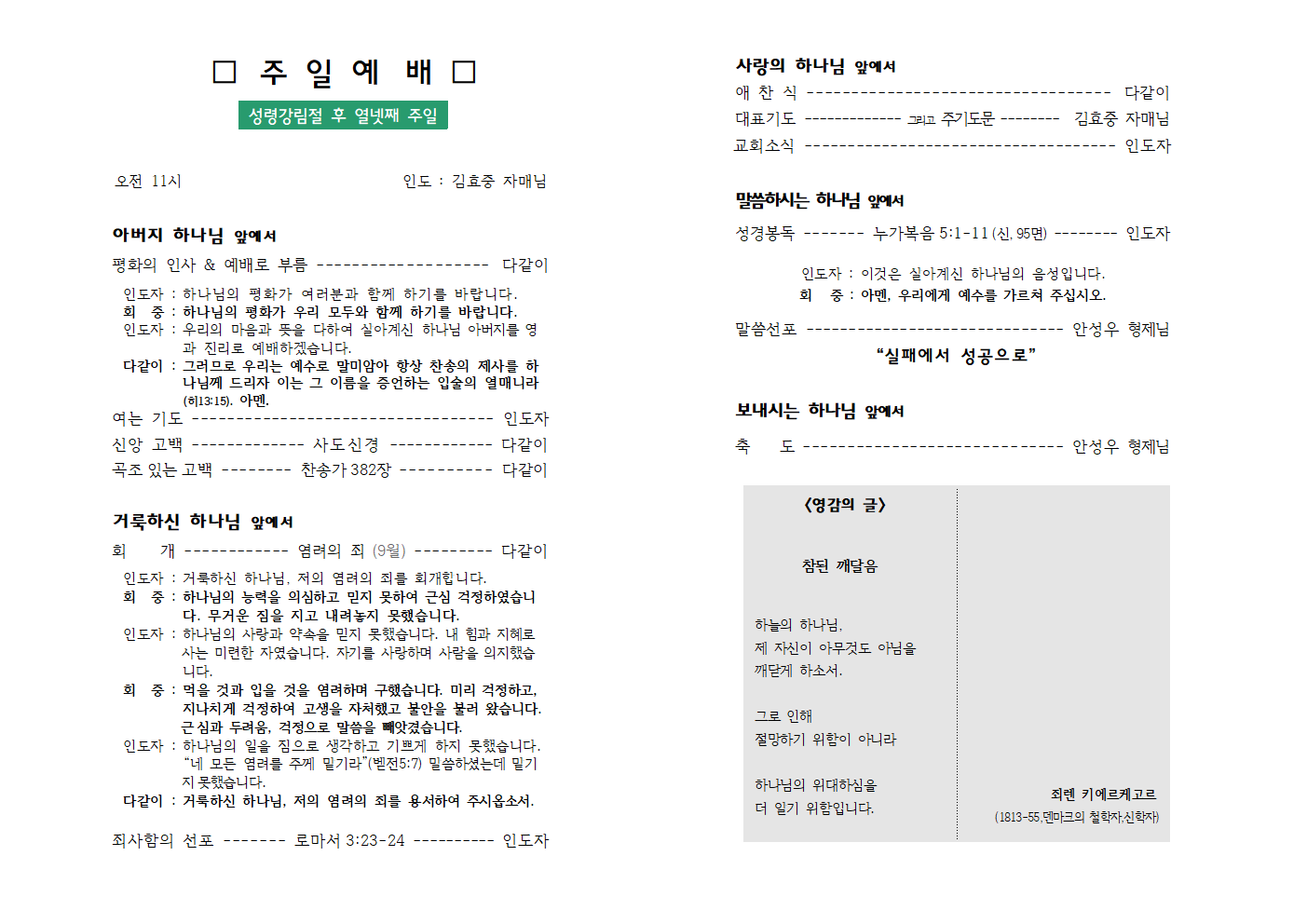 | 9월 7일 (성령강림절 후 열셋째 주일) 주보 (0) | 2025.09.07 |