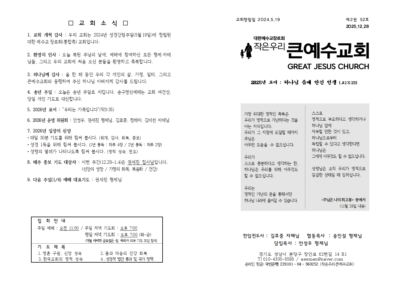 경기도 성남시 분당구 장안로62번길 14 B1 / 010-4300-6588 (안성우 목사) / aswmen@naver.com